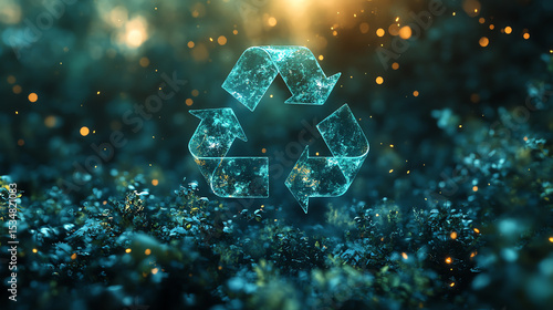 A glowing, digital recycling symbol against a natural backdrop, symbolizing sustainability and eco-friendliness in our world.