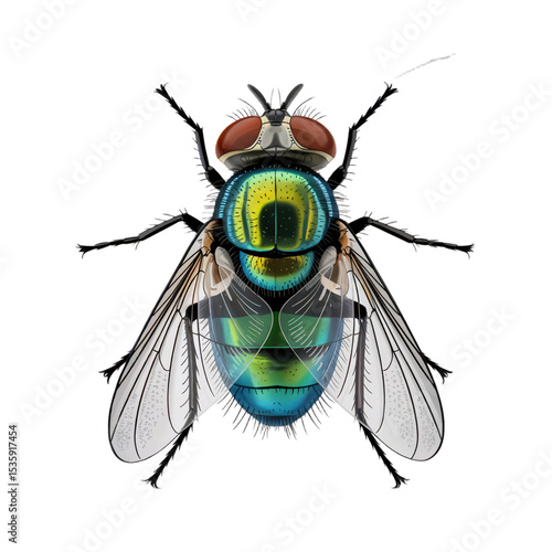 Detailed closeup of a vibrant green blue fly insect art bug body on transparent background