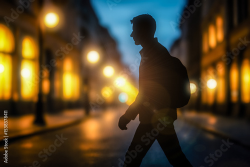 Fototapeta - Pedestrian Safety at Night. Silhouette of pedestrian crossing dark city street at night with blurred bokeh lights, concept for road safety and accident prevention