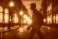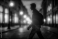 >Plakat>Pedestrian Safety at Night. Silhouette of pedestrian crossing dark city street at night with blurred bokeh lights, concept for road safety and accident prevention