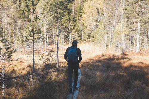 Fototapeta - Adventurer walks on a narrow wooden trail in Oslo Marka, surrounded by golden autumn light and the silent whisper of Nordic wilderness. Norwegian raw nature