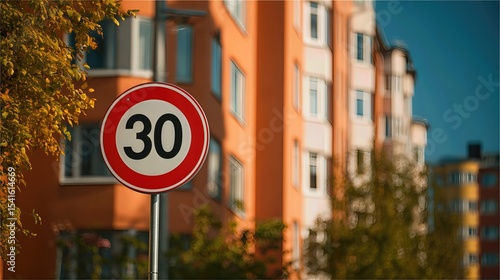 Fototapeta - The “30” speed sign is placed near housing in an autumn setting, enforcing road rules and protecting pedestrians.