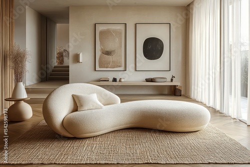 Fototapeta - Minimalist living room with modern curved beige sofa, textured area rug, wooden floor, soft natural light through sheer curtains, abstract art on wall, and simple decor