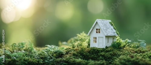 A small white house surrounded by lush green moss and plants, bathed in soft natural sunlight, evokes a peaceful and eco-friendly atmosphere