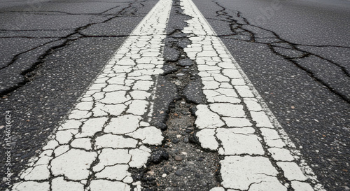 Fototapeta - A crumbling asphalt road with a severely cracked and broken white line representing decaying infrastructure neglect and a difficult path or journey