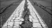 >Plakat>A crumbling asphalt road with a severely cracked and broken white line representing decaying infrastructure neglect and a difficult path or journey