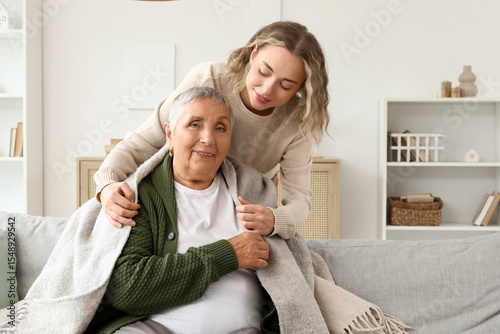 Fototapeta - Young woman covering her grandmother with warm plaid on sofa at home