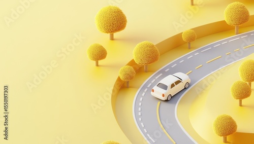 Minimalist, 3D rendered scene of a winding road with a small white car and yellow trees