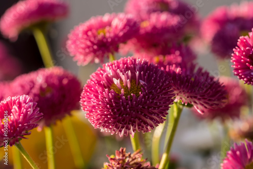 Fototapeta - Czerwone stokrotki w świetle zachodzącego słońca wiosennego dnia. Żywe różowe stokrotki angielskie (Bellis perennis) kwitną, ich pomponowe główki skąpane są w ciepłym świetle słonecznym.