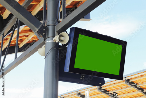Fototapeta - Train station digital display. Blank green screen for timetable. Empty board at modern railway platform. Travel and transport concept. Editable sign for schedule or information. Urban infrastructure.