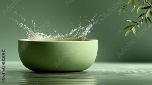 Fototapeta - Kropla wody wpada do zielonej miski, tworząc dynamiczne rozbryzgi. Scena symbolizuje świeżość, naturę i energię, z subtelną gałązką w tle.