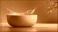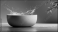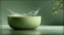 Kropla wody wpada do zielonej miski, tworząc dynamiczne rozbryzgi. Scena symbolizuje świeżość, naturę i energię, z subtelną gałązką w tle.