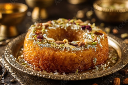 Fototapeta - Ghevar is a crispy Indian dessert from Rajasthan made with refined flour sugar and ghee topped with silver foil and nuts