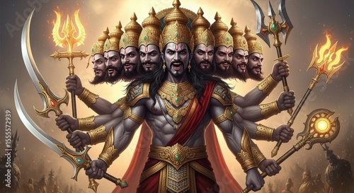 Fototapeta - Ai generated image of a powerful ten headed demon king ravan with multiple weapons stands ready for battle