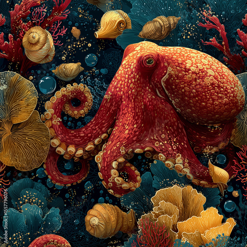 Fototapeta - Artystyczna ilustracja podwodnego świata z dużą, czerwoną ośmiornicą, muszlami i barwnymi koralami, na głębokim, ciemnoniebieskim tle.