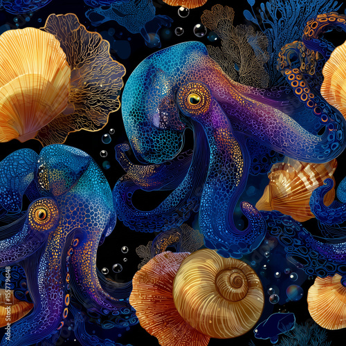 Magiczne podwodne królestwo: dwa ośmiornice w odcieniach błękitu i fioletu, otoczone złotymi muszlami i koralami na czarnym tle.