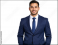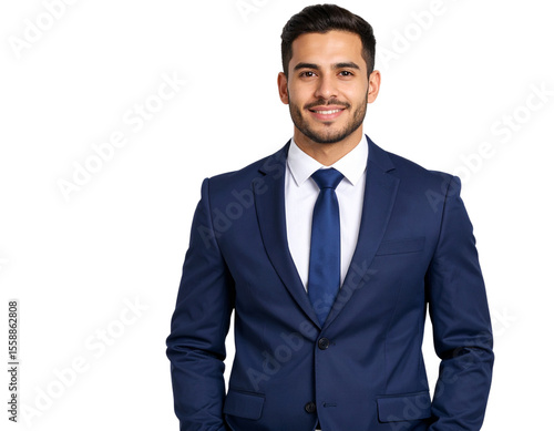 Confident young entrepreneur, handsome man in a navy blue suit and tie, transparent background.