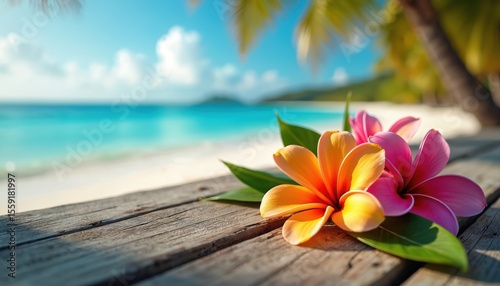 Fototapeta - Vibrant tropical flowers on wooden table. Beach background calm turquoise water, white sand. Vacation, travel, relaxation vibes. Sunny weather. Summer design, nature inspiration, coastal scenery,