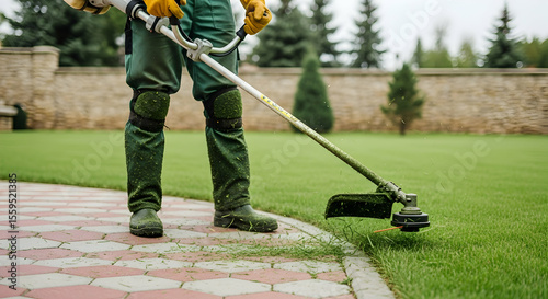 Fototapeta - Lawn Care Professional Edging Grass with Trimmer Tool