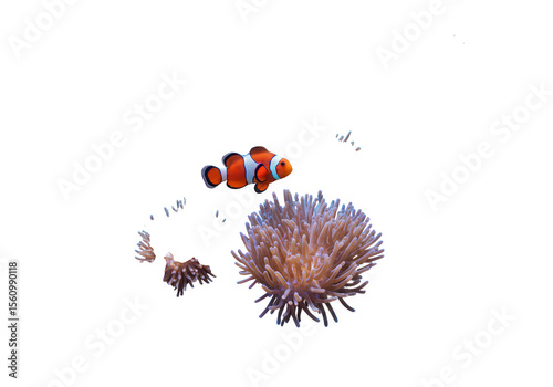 Fototapeta - An orange clownfish swims near a pale pink sea anemone isolated on transparent background