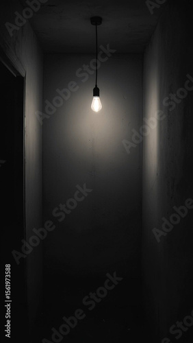 Fototapeta - 小さくて暗い部屋に吊るされた電球が、裸の壁を柔らかな光で照らし、ミニマルで孤立した雰囲気、リアルな照明と影。