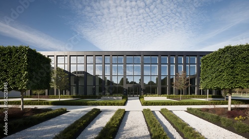Fototapeta - Modern building facade with symmetrical landscaping and cloudy sky