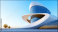 Modern architectural design features unique building with curved lines and large glass windows, set against clear blue sky. structure exudes