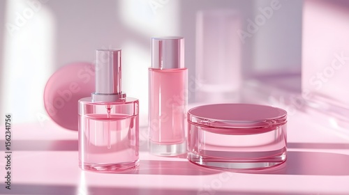 3D render of translucent pink bottles and containers on a reflective pink surface.