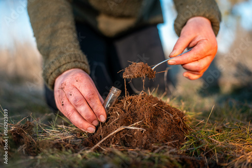 Fototapeta - women in agriculture looking at a soil sample. girl on a farm looking at plant roots, female farmer looking at ecosystem health