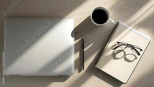>Plakat>Flat Lay of Workspace with Laptop and Coffee, Minimal Office Desk with Notebook and Cappuccino, Business Workspace Setup with Eyeglasses and Laptop, generative ai