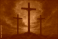 Sacred oil painting depicting three crosses on Calvary hill representing crucifixion in traditional religious art style
