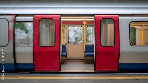Fototapeta - Side view of empty Subway train with open doors, station platform ready for passengers