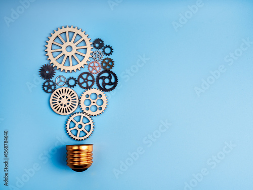 Fototapeta - Innovation, solution workflow, creative idea, energy and power, thinking inspiration concept. Many mechanic gears and cogwheels arrange as electric light bulb on blue background with copy space.