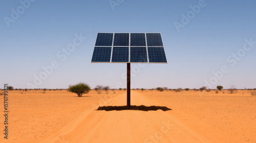 Fototapeta - solar panel array stands alone in a vast desert landscape under a clear blue sky.