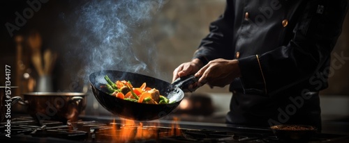 Fototapeta - The chef skillfully prepares a vibrant stir-fry in a modern kitchen.
