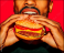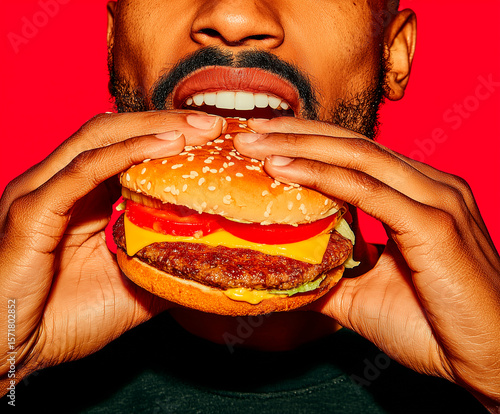 Fototapeta - lose-up of a white man eating a burger , black shirt