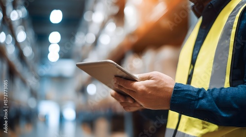 Fototapeta - Warehouse worker using tablet device to monitor inventory schedule deliveries and ensure control at a storage facility