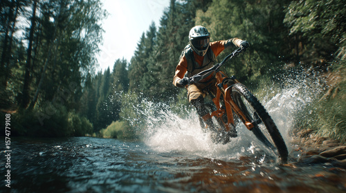 Fototapeta - Rowerzysta pokonuje strumień, tworząc dynamiczne rozbryzgi wody w lesie. Energia i ruch w naturze uchwycone w kadrze.