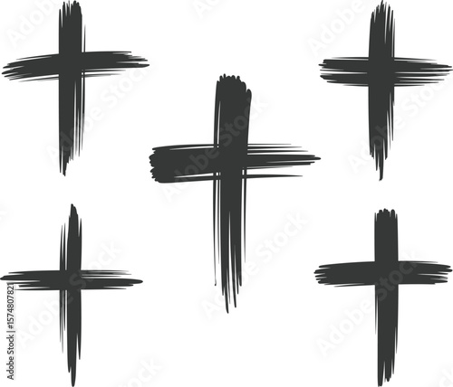 Set of black grunge brush stroke crosses isolated on white background, abstract handmade paint symbols for graphic design elements