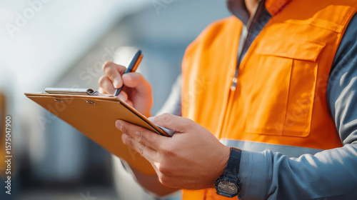 Fototapeta - Embassy inspector reviewing equipment checklist in outdoor setting