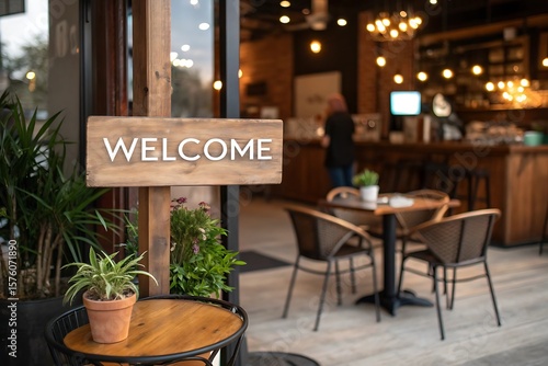 Wooden welcome sign outside cafe with plants and seating wooden sign restaurant
