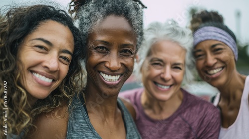 >Plakat>Happy multi generational women having fun together - Multiracial friends smiling on camera after sport workout outdoor - Main focus on african female face, no logos, no brands
