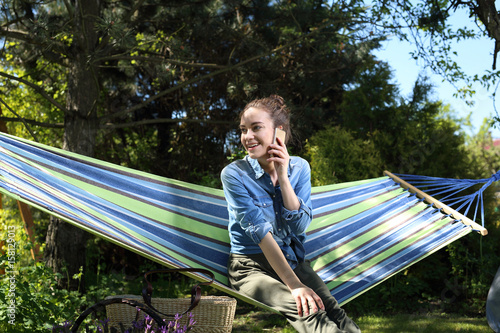 Fototapeta - Mój piękny ogród.Młoda atrakcyjna kobieta wypoczywa na hamaku w ogrodzie rozmawiając przez telefon