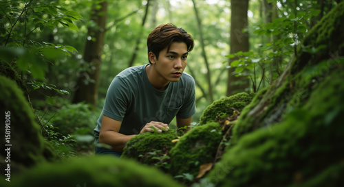 Fototapeta - Man crouching in forest examining moss on fallen log during nature exploration. Environmental study and outdoor education for ecological research and learning