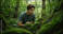 >Plakat>Man crouching in forest examining moss on fallen log during nature exploration. Environmental study and outdoor education for ecological research and learning
