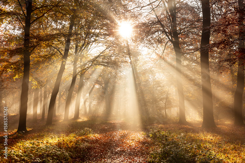 Fototapeta - Sunlight filtering through tall trees in an autumn forest, casting warm rays over a leaf-covered footpath.