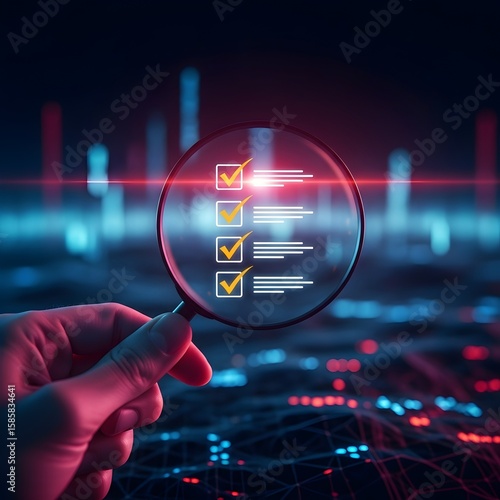 >Plakat>Analysis of a checklist with completed tasks under a magnifying glass suggests progress and successful project completion on a blue background.
