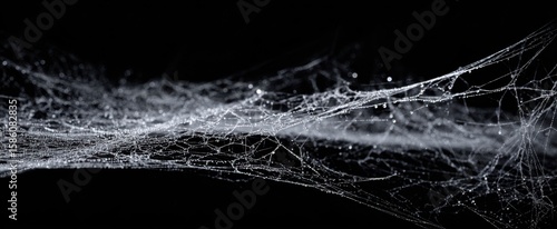 Fototapeta - The delicate web glistens with droplets against a dark background.