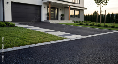 Fototapeta - Allée en gravier enrobé devant le garage de la maison, design extérieur, aménagement extérieur paysager