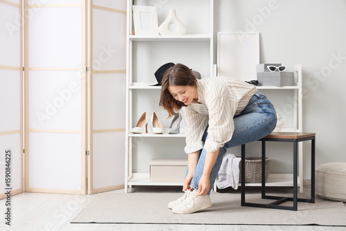Fototapeta - Young woman tying laces of sneakers in hallway